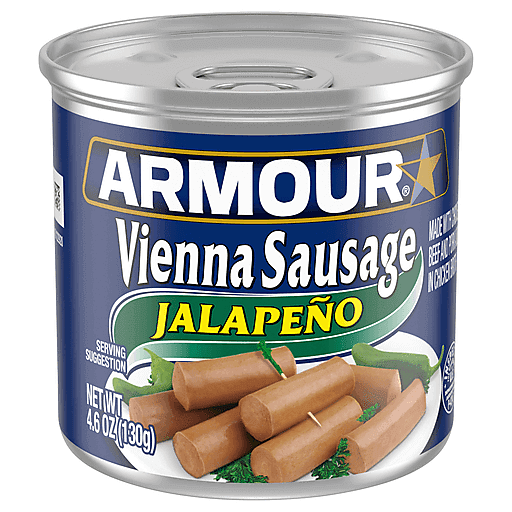 Armour Star Jalapeno Flavored Vienna Sausage are ready to eat sausages with great flavor. The Vienna sausages are made with chicken, have beef and pork added and include jalapeno flavor that adds a spicy kick. This Vienna sausage can be eaten right out of the can, so you can enjoy this canned meat as a ready to eat sausage snack. Try adding the canned sausage to your favorite recipes for an easy meal, or serve them as an appetizer everybody will love. Store the canned food in your pantry so you always have some delicious Vienna sausage on hand. Keep the spicy sausage refrigerated after opening to keep fresh for next time. Make any time Armour Star time.