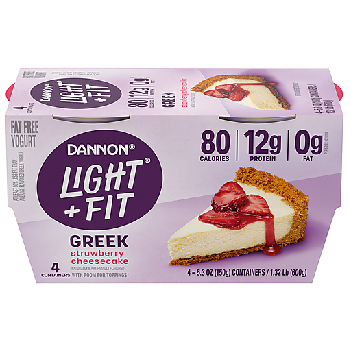 Give your taste buds a reason to rejoice with a four-pack of Dannon Light + Fit Strawberry Cheesecake Greek Fat Free Yogurt Cups. Protein is essential, and with 80 calories and 12g of protein per serving, this light yogurt cup is a satisfying and convenient option for adding complete protein every day. Add flavor to your day, every day, with a single serving snack cup of Dannon Light + Fit Strawberry Cheesecake Greek Fat Free Yogurt.