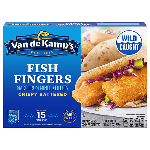 Van de Kamp's Crispy Battered Fish Fingers are a tasty addition to any recipe. This mouthwatering, wild-caught pollock is surrounded by a golden breading that is the perfect combination of flavor and crispiness. Whether you prefer adding them to a sandwich, making fish tacos or eating them dipped in tartar sauce, you will love these tasty fish tenders. They are also a good source of Omega-3s, so you can feel good about the seafood you're eating. Easily prepared in the air fryer or the oven, they're a natural source of Omega-3s*, are a good source of protein, with 9 grams per serving, and are certified sustainable seafood** so you'll feel good about what you're feeding your family.