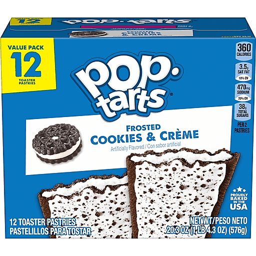 Pop-Tarts toaster pastries are the perfect sweet treat at breakfast, for a lunch snack, or dessert. Featuring a sweet Frosted Cookies and Creme filling and chocolatey crumbles in a soft pastry crust, this ready to eat treat is perfect for kids snacks and adult snacks on the go. Pack Pop-Tarts Frosted Cookies and Creme in kids lunchboxes for school snacks, or stock the office pantry with this individually wrapped grab and go adult snack. Pop them in the toaster and pair with milk, create your own ice cream sandwiches, or incorporate into your favorite dessert recipe for a sweet treat. These irresistible snacks for adults and kids provide a good source of three B vitamins. Stock your pantry with these shelf stable snacks and enjoy ready to eat treats anytime. A flavor for everyone, including beloved classics like Frosted Blueberry or Frosted Cherry, or our more indulgent flavors, Frosted S'mores or Frosted Chocolate Fudge.