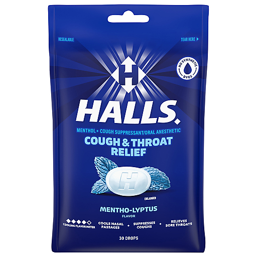 HALLS Relief Mentho-Lyptus Cough Drops are ready for whatever life throws, or coughs, your way. With 5.4 mg of menthol per drop, these eucalyptus cough drops relieve coughs, soothe sore throats and cool nasal passages to quickly relieve your worst symptoms. Whether you're using these cough suppressant drops for sore throat relief, cough relief or as an oral anesthetic, dissolve one drop in your mouth slowly, and repeat every two hours as needed. HALLS Relief cough drops are formulated for adults and children five years and older. These sore throat drops are individually wrapped and come in a resealable bag for portability and freshness, making them perfect for a healthy gift or care package. This bag holds 30 drops.
