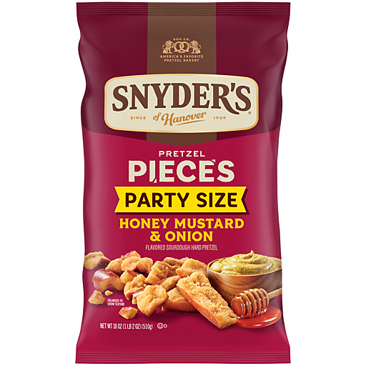 Snyder's of Hanover Honey Mustard and Onion Pretzel Pieces are bursting with craveable flavor in every bite! Enjoy crunchy sourdough pretzels, generously seasoned with tangy mustard, mild onion flavor, and the sweetness of honey. You'll love the crunch, hearty satisfaction, and bold flavor found in every bite. Our pretzel pieces are the perfect snack to crunch on during game day or as a lunchtime side. Snyder's of Hanover has been America's Pretzel Bakery since 1909, and our pretzels give you that delicious crunch for the perfect snack! Made in a facility that does not process peanuts, Snyder's pretzels are made from wholesome ingredients, kneaded, and oven baked to seal in all the flavor. Snyder's of Hanover pretzels have been shared across tables, across generations, and across the country, making us America's favorite pretzel brand. There’s nothing like the bold flavor of honey mustard and onion, and with a 18-oz. Party Size bag, it’s easy to feed your craving any time.